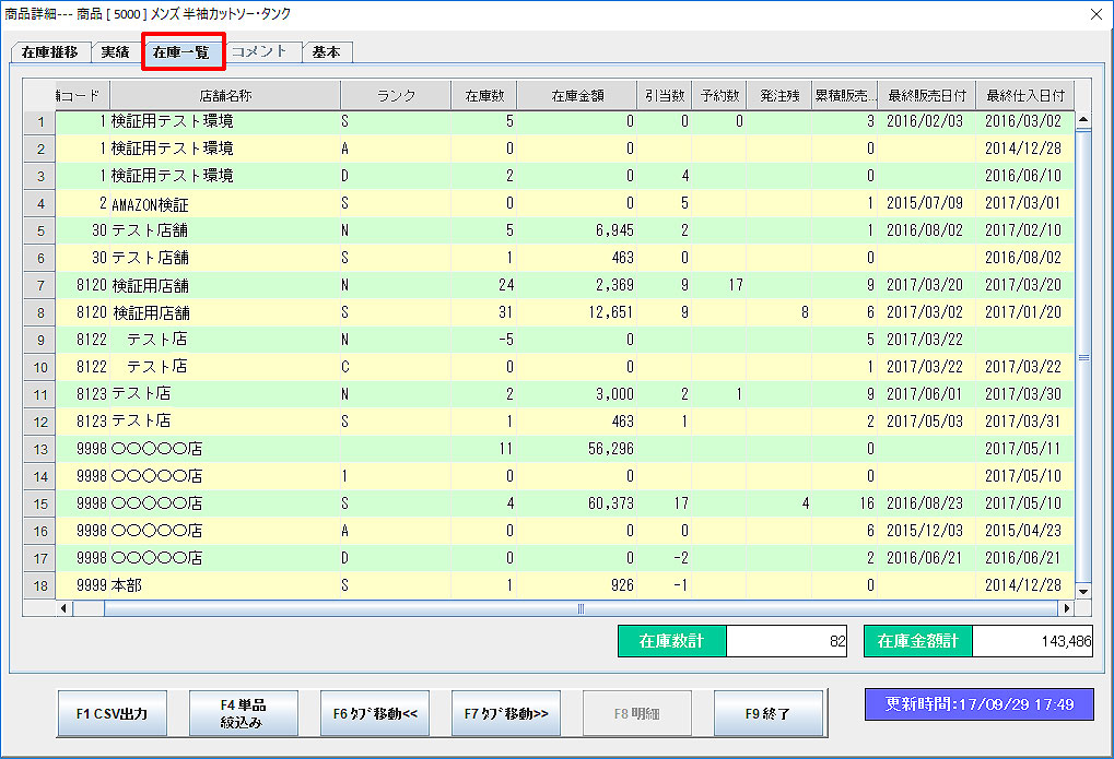 「F4単品絞込み」:価格管理ランクで単品コードを絞込み、在庫推移を表示します。