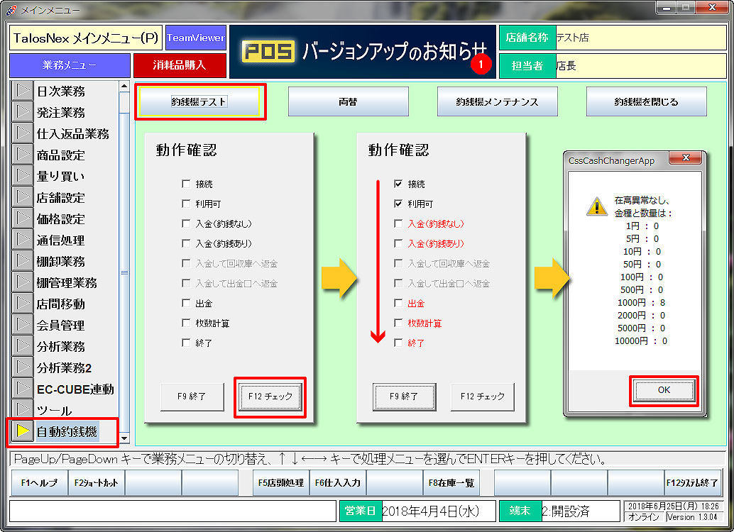 業務メニュー:「自動釣銭機」→処理メニュー:「釣銭機テスト」をクリックします。