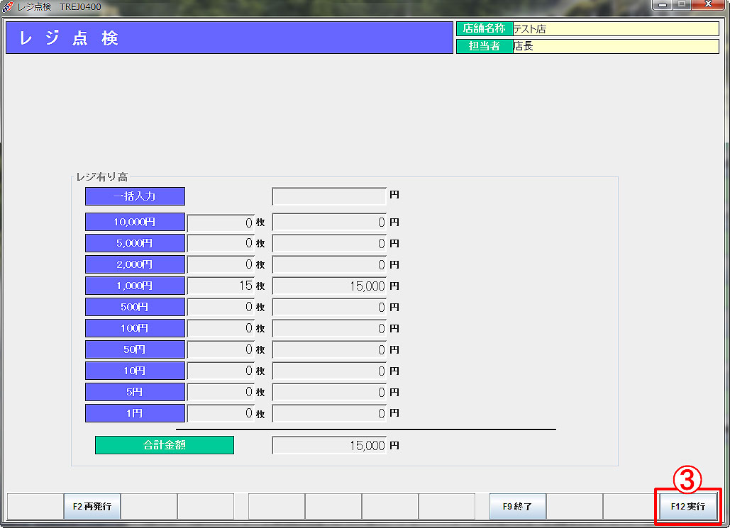 ③ 標準の【レジ点検】画面が表示されます。