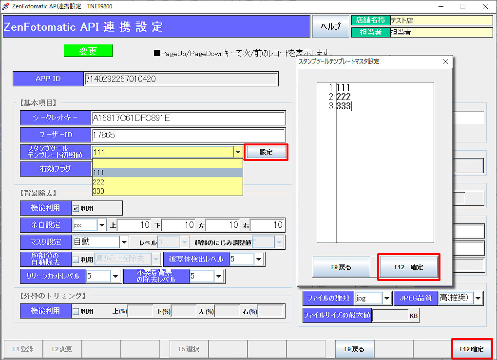 ※ ラク撮上でスタンプツールテンプレートを直接設定した場合は、その設定が反映されます。 - 背景除去・トリミング・リサイズ・背景色など:任意の設定値を入力します。