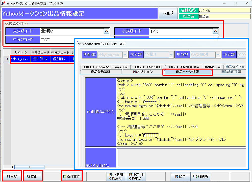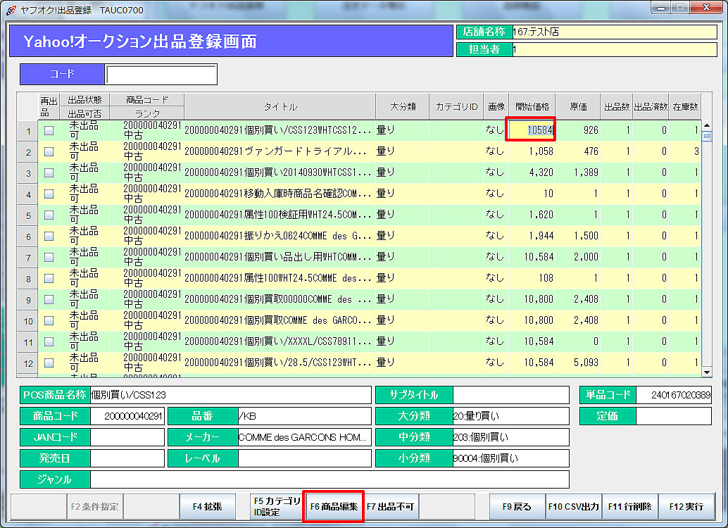 出品登録商品を呼び出し、「F6商品編集」より商品タイトル・コメントの編集を行います。