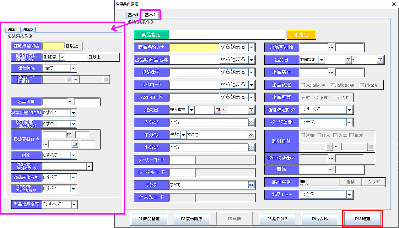 出品状態に「出品済のみ」を選択し、分類・在庫滞留間隔・価格変更後滞留間隔など検索条件を入力して検索します。