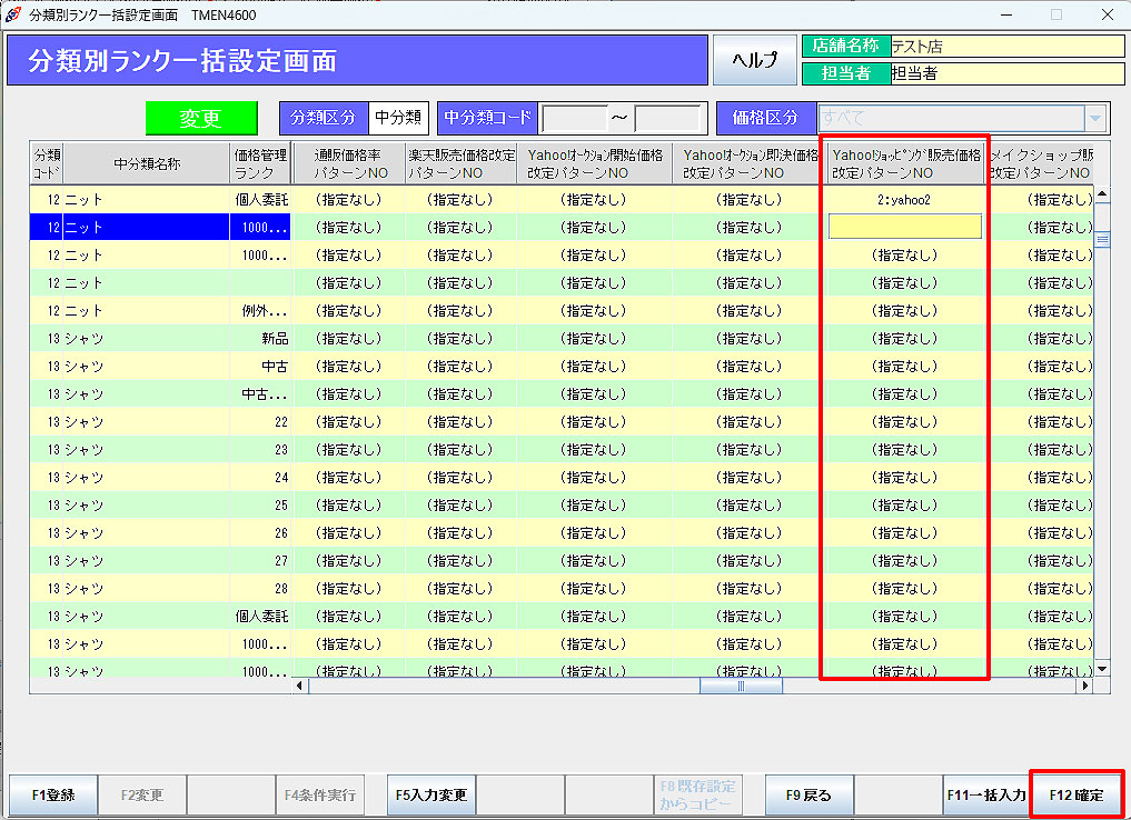 価格改定パターンを適応したい中分類・価格ランクを選択し、Enterキーを押します。