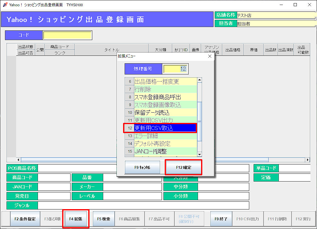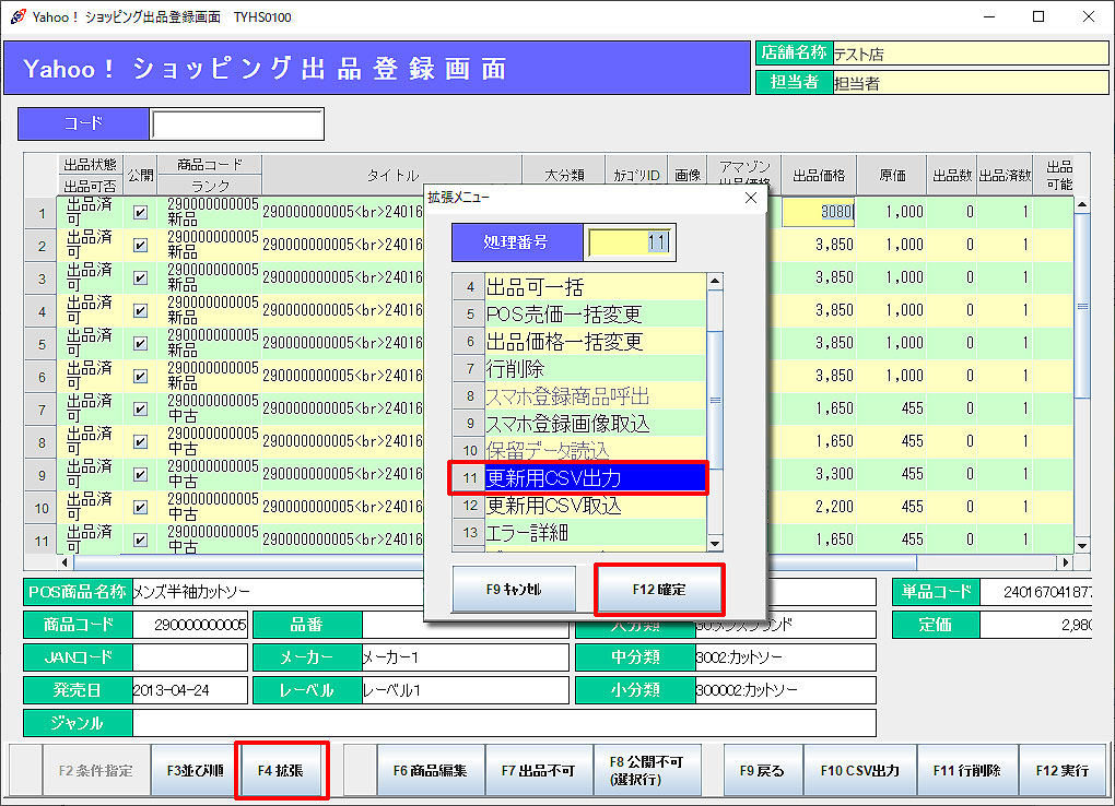 「F4拡張」メニューより「更新用CSV出力」を選択し、「F12確定」をクリックします。