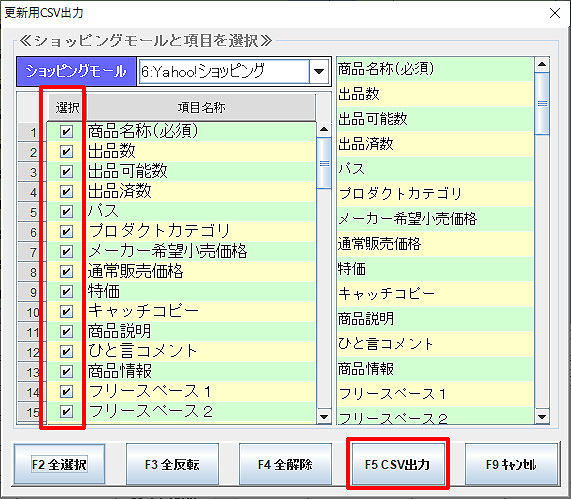 該当する項目の「選択」にチェックを入れるか、「F2全選択」で全項目選択し、「F5CSV出力」をクリックします。