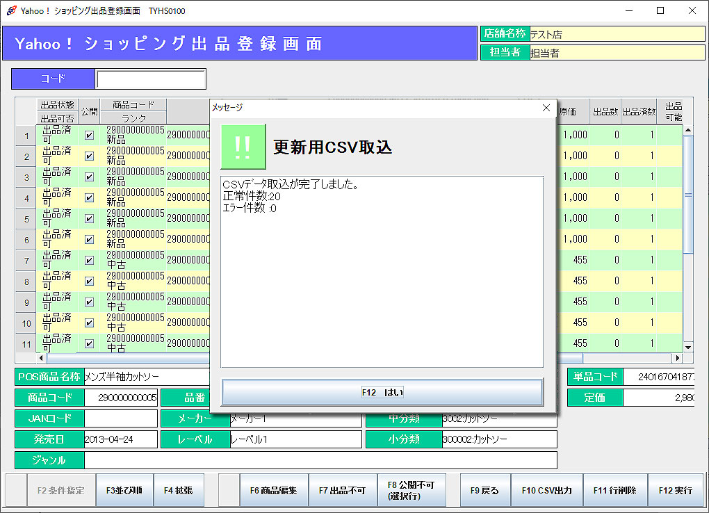 「F12はい」:再度CSV取込確認メッセージが表示され、「F12はい」で取込処理を行います。
