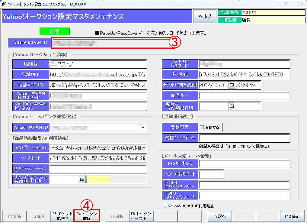 • Yahoo!オークション情報:店舗名、店舗URL、Yahoo!JAPANビジネスID、パスワードなどを登録します。