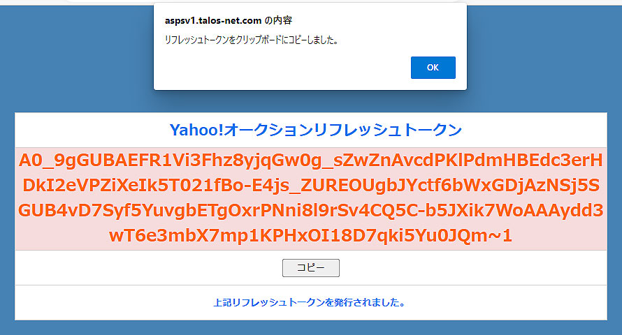 リフレッシュトークンコピー 「リフレッシュトークンをクリップボードにコピーしました。」と表示されます。→「OK」