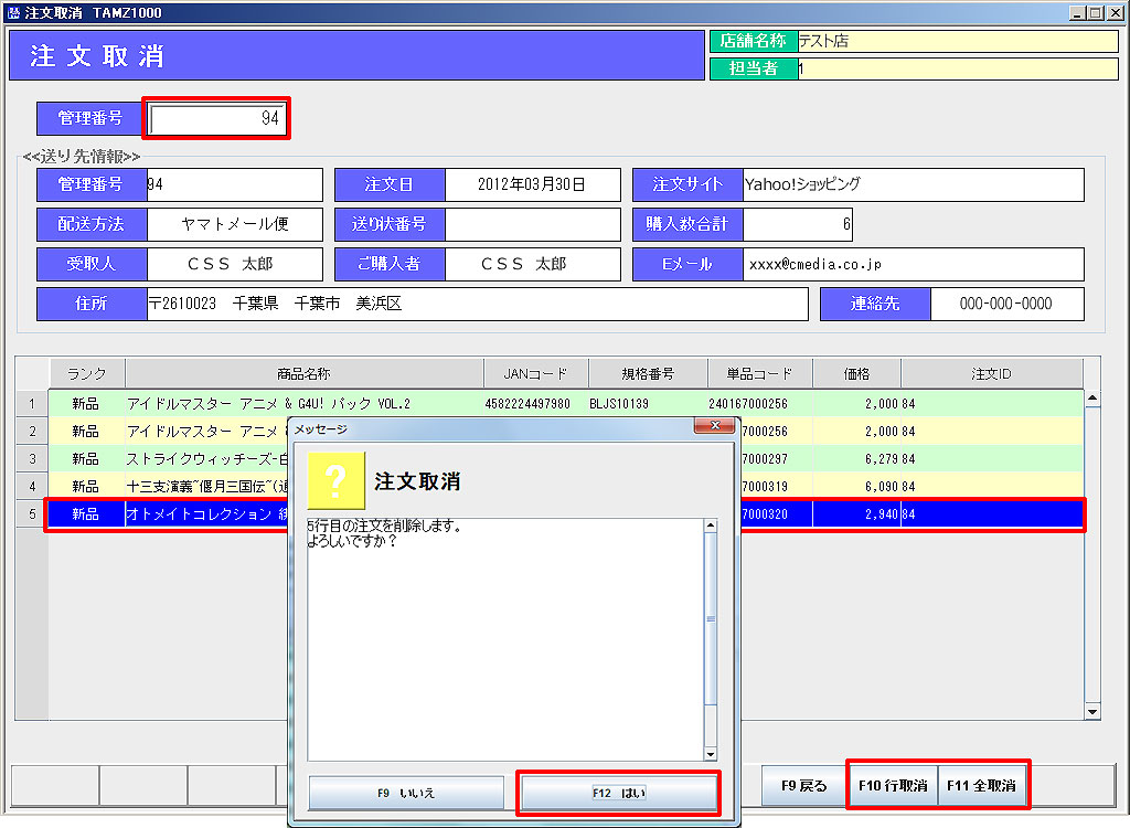③ 「F11全取消」、または明細の中から注文を取消したい商品行を選択し、「F10行取消」をクリックします。
