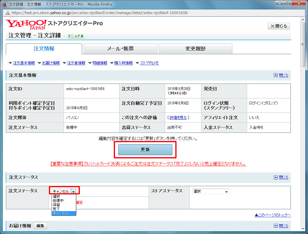 注文取消の方法によっては、Yahoo!オークション側とタロス上の在庫数に誤差が生じる場合がありますので、 先にタロス上で注文取消処理を実行してから、ストアクリエイターProで注文取消処理を行うようにしてください。