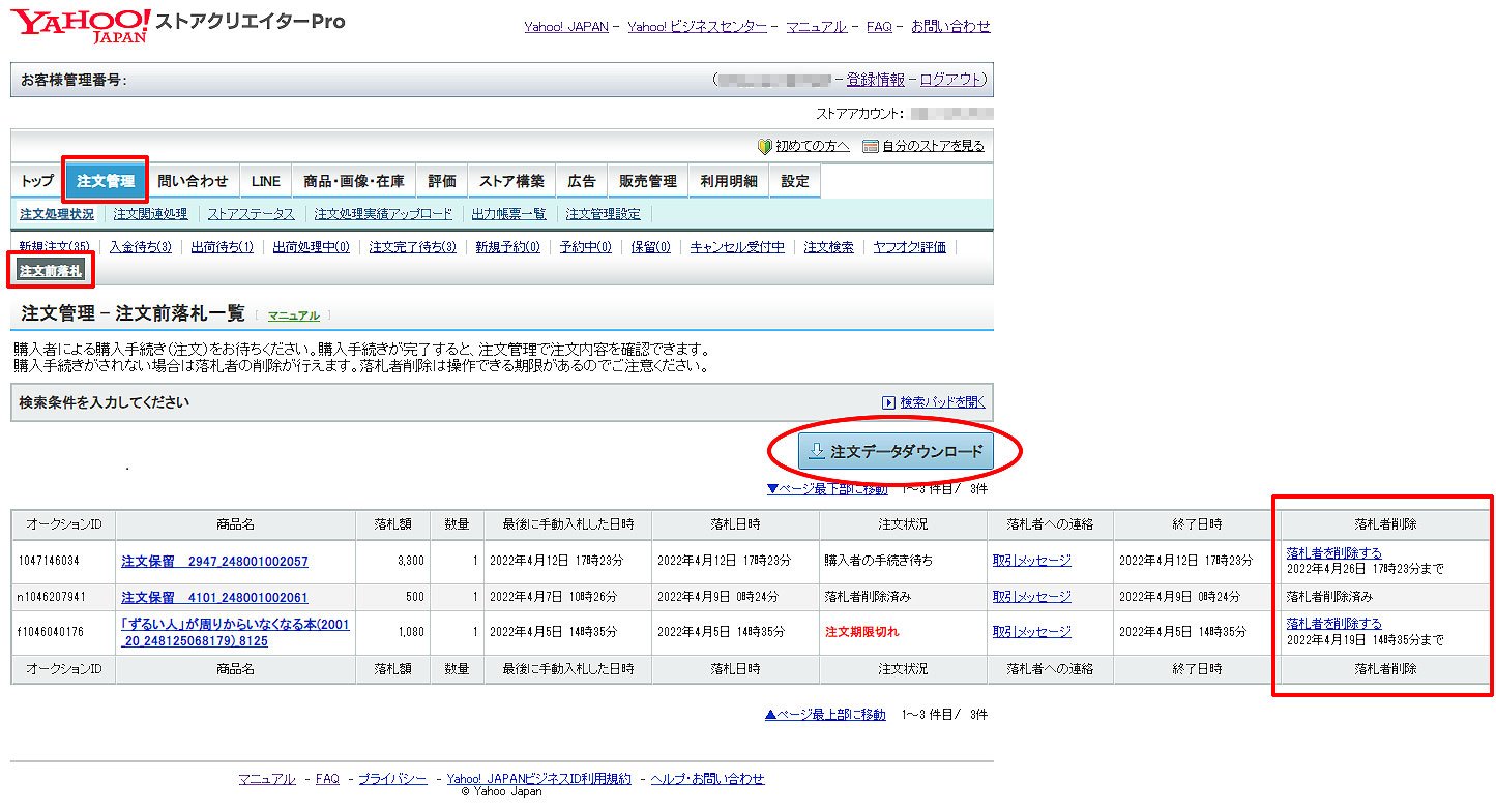 ① ストアクリエータPro>注文管理>注文前落札