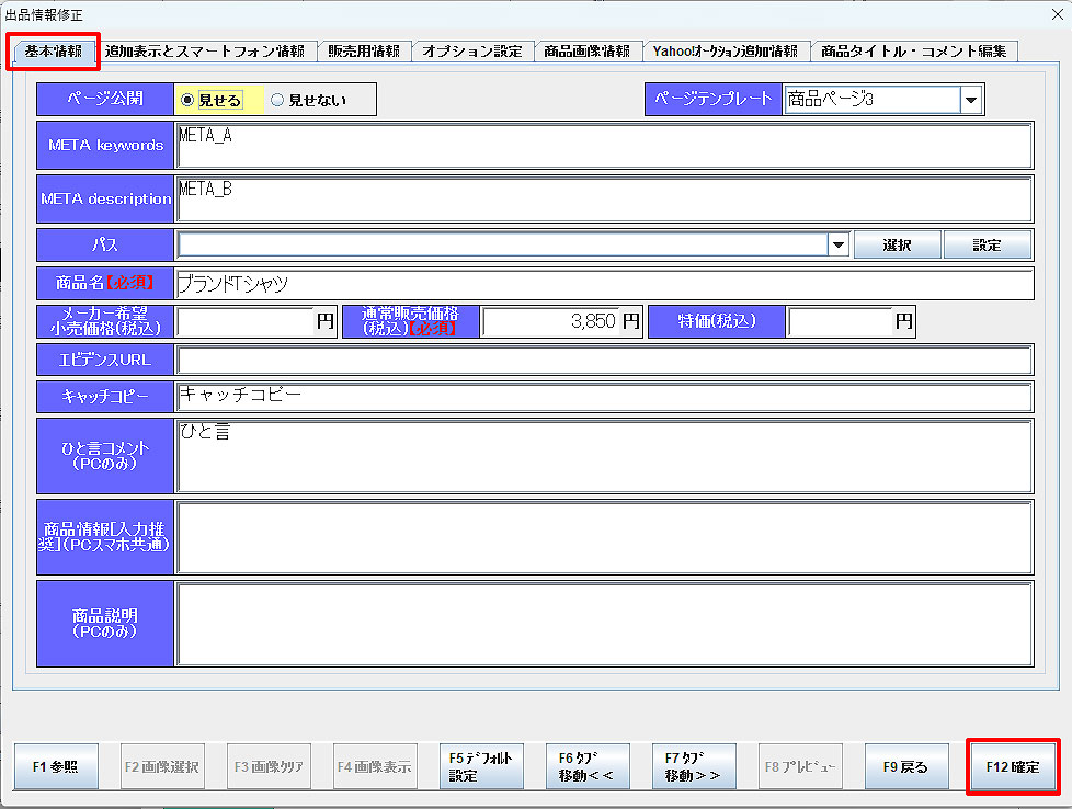 「F12確定」で商品情報を保存し、出品登録画面に戻ります。