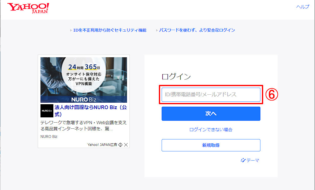 ⑥ 続いて「Yahoo! JAPAN ログイン画面」が表示されます。IDとパスワードを入力してログインします。
