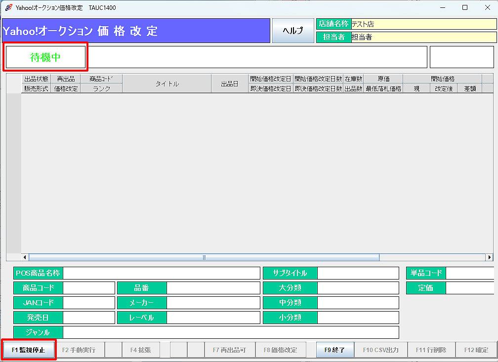 業務メニュー:「Yahoo!オークション連動」→処理メニュー:「Yahoo!オークション価格改定処理画面」を開きます。