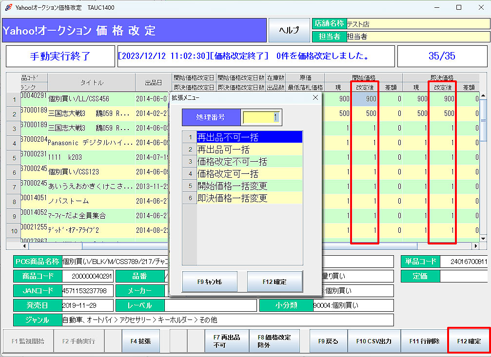 Yahoo!オークション価格改定 価格改定対象商品が表示されます。