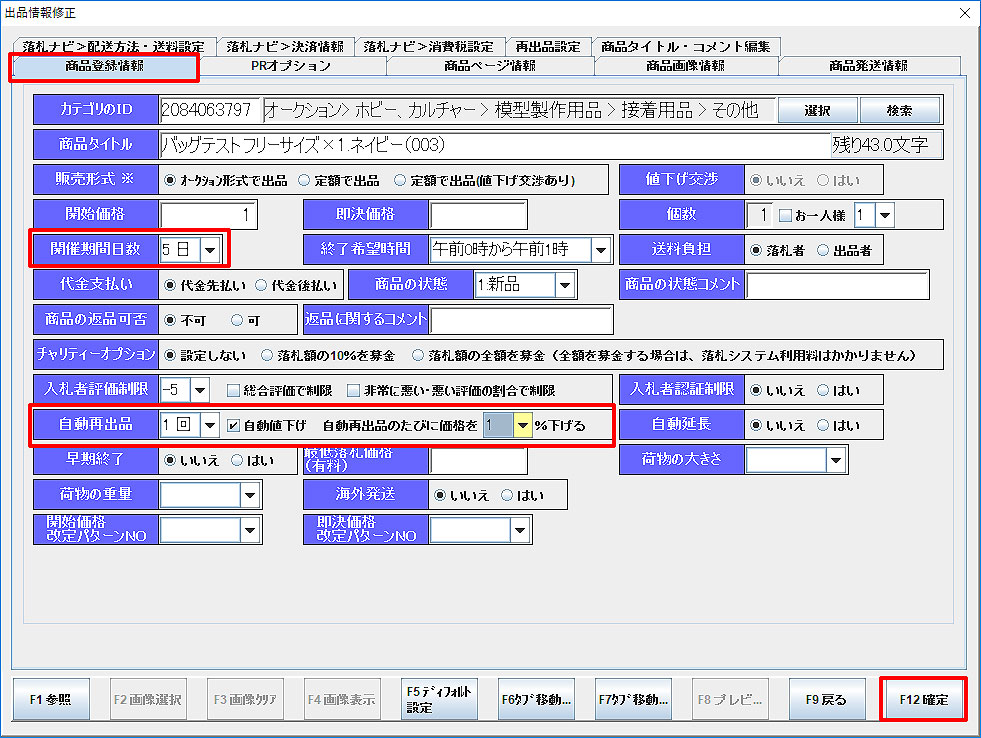 ※ 「F5ディフォルト設定」をクリックすることで、次回より、出品登録時に設定した再出品の設定がディフォルトとなります。