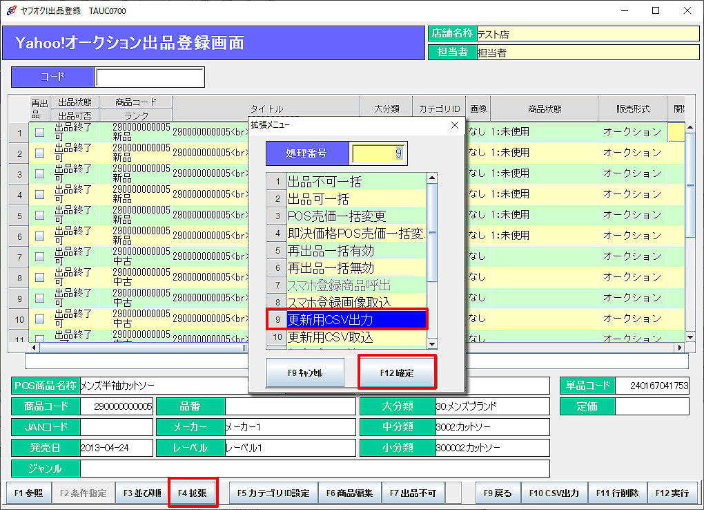「F4拡張」メニューより「更新用CSV出力」を選択し、「F12確定」をクリックします。