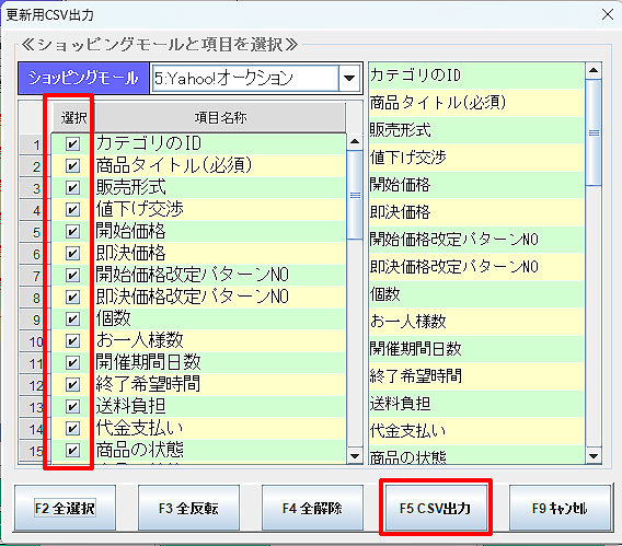 該当する項目の「選択」にチェックを入れ、 「F5CSV出力」をクリックします。