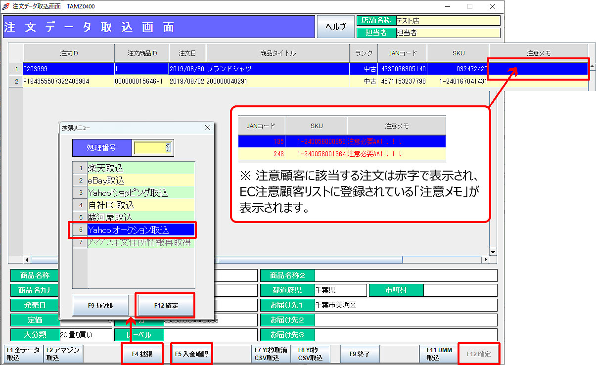① 「F1全データ取込」または「F4拡張>Yahoo!オークション取込」をクリックします。