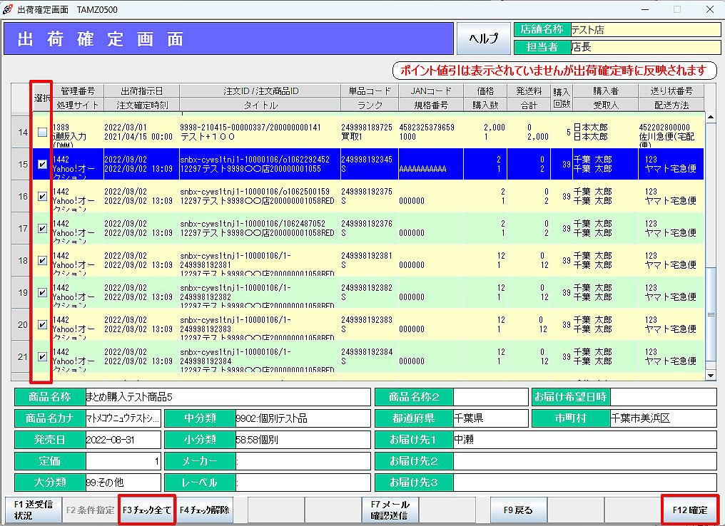 ※ 出荷商品の選択は伝票単位です。 出荷商品を選択すると、選択した商品が属する伝票内全ての商品にチェックが入ります。 「F3チェック全て」をクリックすると、表示された出荷可能商品全てが選択されます。