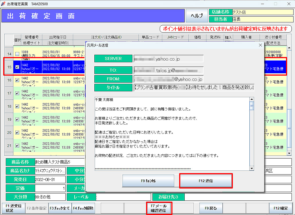 ※ この画面からメールを送信した場合は、「F12」で出荷を確定した際に、メールは送信されません。