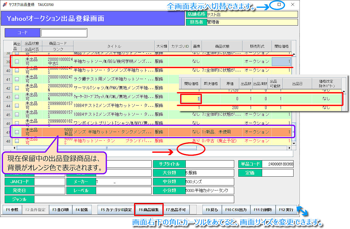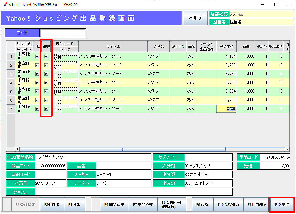 • 「F7出品不可/出品可」:選択した商品を出品しない/する