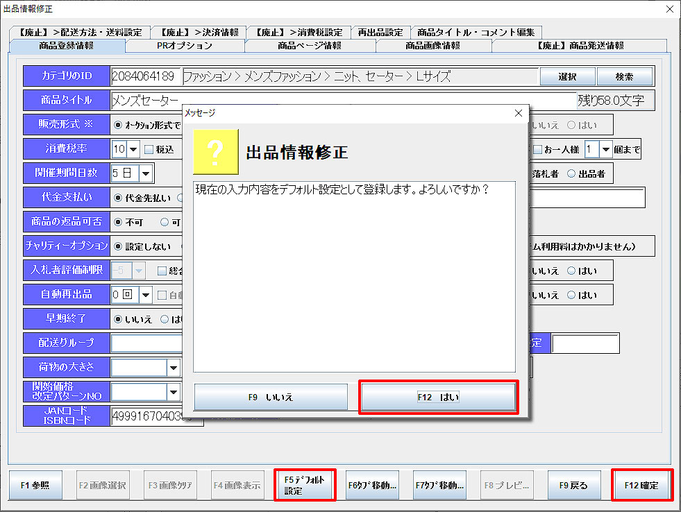 デフォルト設定後「F12確定」で出品情報の設定を確定してください。