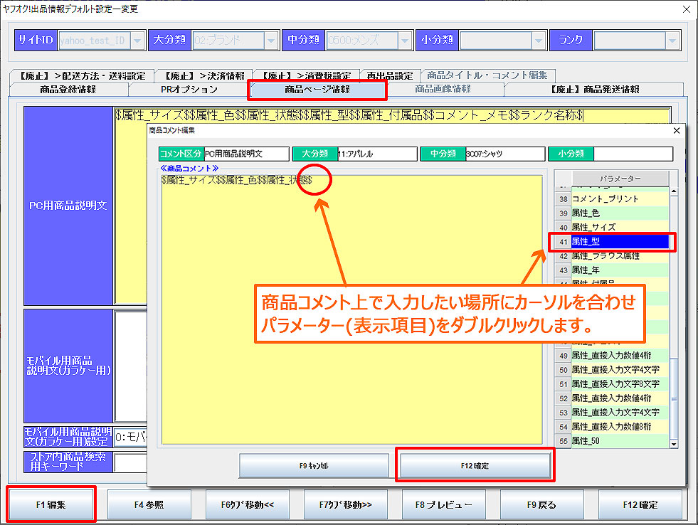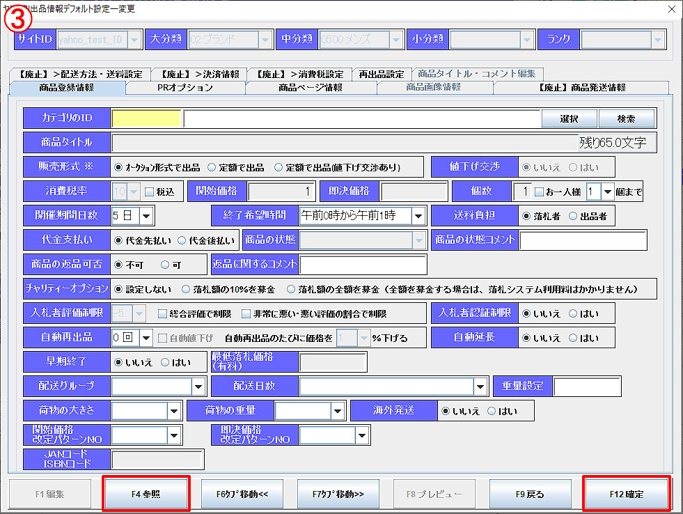 ③「Yahoo!オークション出品情報ディフォルト設定-変更画面」が表示されます。 出品情報を編集し、「F12確定」で変更を確定します。