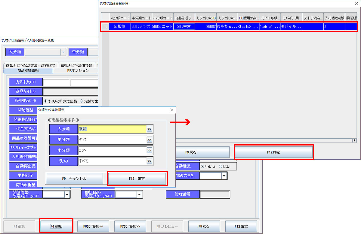【出品情報ディフォルト設定】画面で「F4参照」をクリックします。【分類ランク条件指定】画面が表示されます。 検索条件を指定して出品情報を抽出します。 利用したい出品情報を選択して「F12確定」をクリックすると、そのデータが反映されます。 編集して新しく登録することができます。