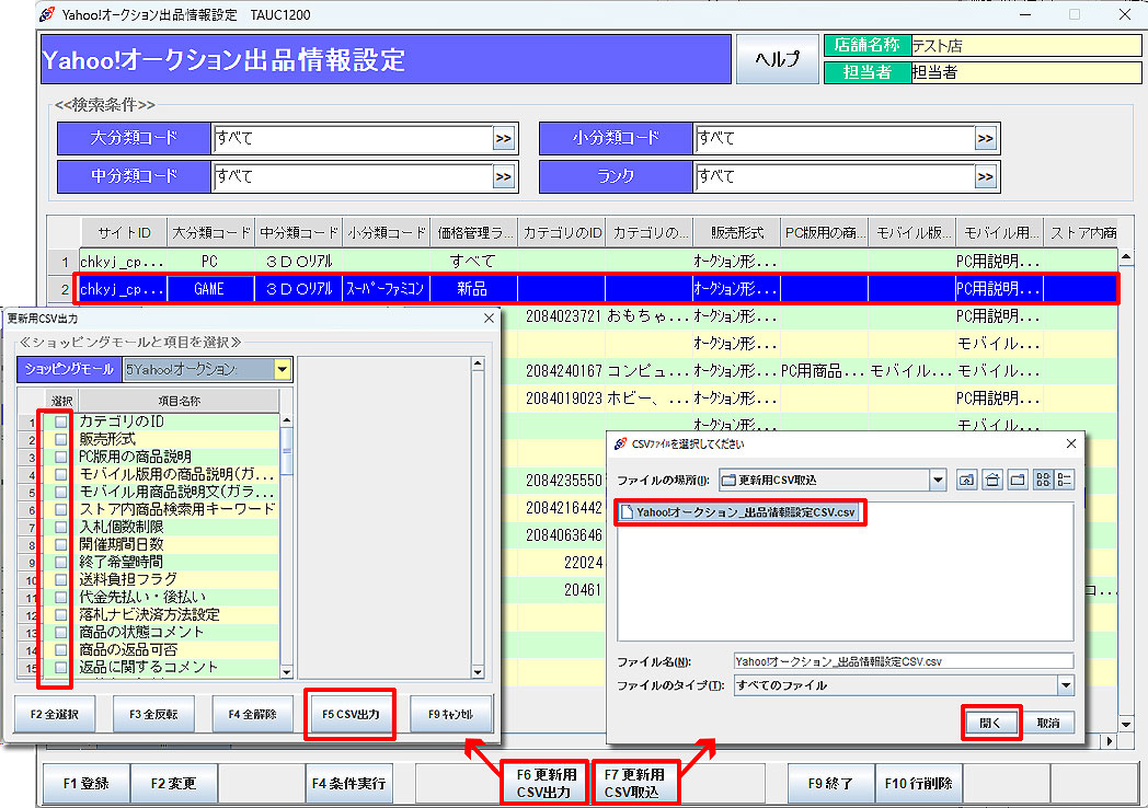 【出品情報設定】画面で編集を行いたい出品情報を選択し「F6更新用CSV出力」をクリックします。【更新用CSV出力】画面が表示されます。 CSVに出力したい項目の選択列にチェックを入れ、「F5CSV出力」をクリックします。 CSV編集ツールで編集後、「F7更新用CSV取込」より取り込みます。